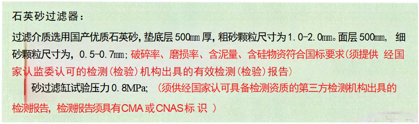 回复:1、砂缸过滤介质选用石英砂,破碎率、磨损率、含泥量、含硅物资符合国标要求(须提供经国家认监委认可的检测(检验)机构出具的有效检测(检验)报告);