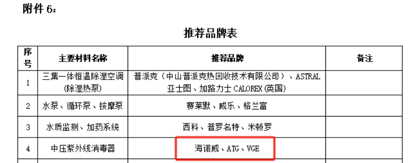 17.根据招标文件,合同附件里推荐的品牌表,中压紫外线消毒器,海诺威、ATG、VGE。能否增加水武仕,西美克、爱克等品牌,杀菌效果一样,性价比更高。请招标方明确。