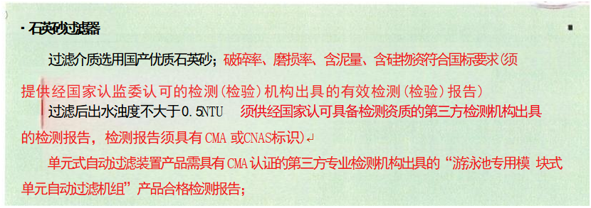 回复:1、“单元式自动过滤装置产品需具有CMA认证的第三方专业检测机构出具的“游泳池专用模块式单元自动过滤机组”产品合格检测报告”,此条删除。