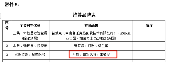 8.合同中“水泵、循环泵、按摩泵”的推荐品牌为:赛莱默、威乐、格兰富。