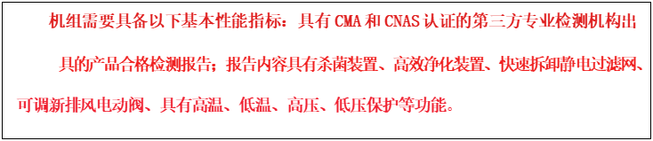 回复:检测报告内容调整为具有杀菌装置、高效净化装置、可调新排风电动阀、具有高温、低温、高压、低压保护功能即可。删除快速拆卸静电过滤网检测内容。所需检测报告可中标后提供。